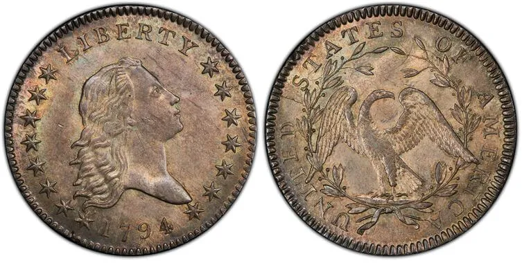 アメリカ連邦政府が発行した初の1ドル銀貨で、1794年に試鋳されたものです。表面には自由の女神の横顔、裏面には国鳥の鷲が描かれています。注目すべき点は、これが銀貨であること。歴史的意義と現存数の少なさにより金属素材としての銀の価値とはかけ離れた価格で落札されています。